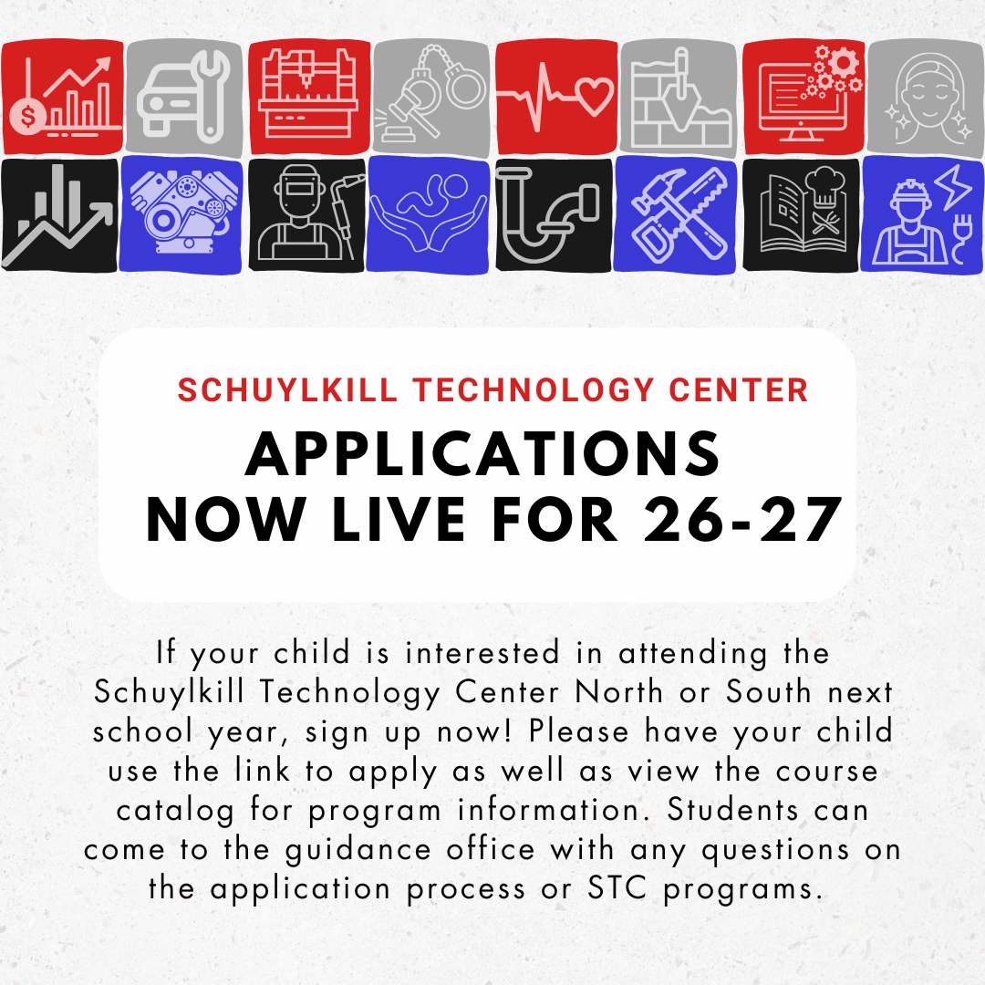 Schuylkill Technology Center (STC) Applications is live: Deadline to register is Jan. 30, 2026.For any questions, please reach out to Miss Rabuck.Link to the Application (STC programs and EHP program)